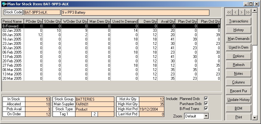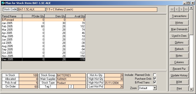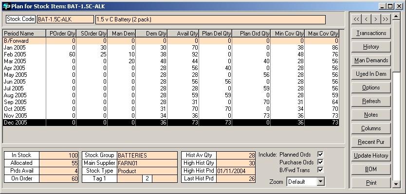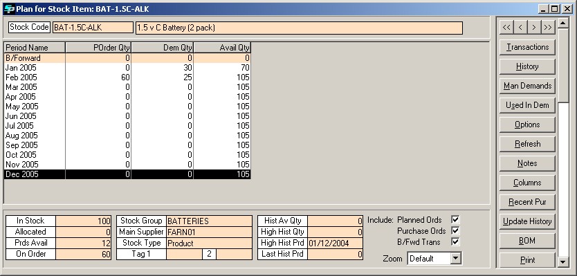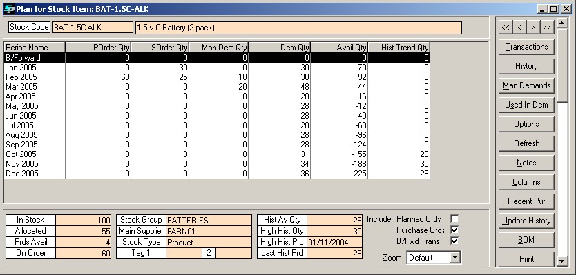The items and their plans are navigated primarily by using the plan list. The plan list lets you use powerful filters to work with just a selection of items you need. see Plan list chapter in the manual.For more information on drilling from the plan screen to more detailed information - See these chapters in the manual Transaction List, Plan Notes, History List, Manual Demands, Used In Demand qty, Recent Purchases, BOM, and Options.You can set the periods to be any length you like from 1 to 100 days or calendar months. The various options such as period length and cover periods are set against each item not globally, so one item can have a different cover or period length from another. Powerful tools are included to update specific options for all items in a certain stock group or from a certain supplier. Options can be exported (to Excel) modified and re-imported. - see Options and Options Updater in the Manual.Manual Demands can be exported and imported - see Manual Demands chapter in the manualStockPlan has user permissions per user and a password based login, so for example a user can be granted permission to view a plan and use the purchase order creation to build a list of suggested purchase orders but NOT be able to amend options or actually create the purchase orders. StockPlan has its own multi-company manager that automatically lists all the companies in your Exchequer system to make it extremely easy to work with many companies. - see user list chapter in the manualMany of the columns have value representations so that you can see for example what your available stock means in terms of value, so you can see how much cash you will have tied up throughout the year on any period in terms of stock. You can see your predicted sales in terms of value. You choose for each column how you want it valued (at cost, selling prices, values from actual transaction, etc) - see available plan columns in the manualYou can view the first period information from a selection of items at the same time in one screen which is great for perusing the immediate stock situation of several items. This list type screen lets you use advanced criteria (see the filter screen) to select the item items.- see Plan Summary chapter in the manual.To read more about the optional StockPlan Purchase Order Creation module see the Purchase Order Creation chapter in the manual.To read more about the optional StockPlan Works Order Processing module see Works Order List and Add New Works Order chapters in the manual. |