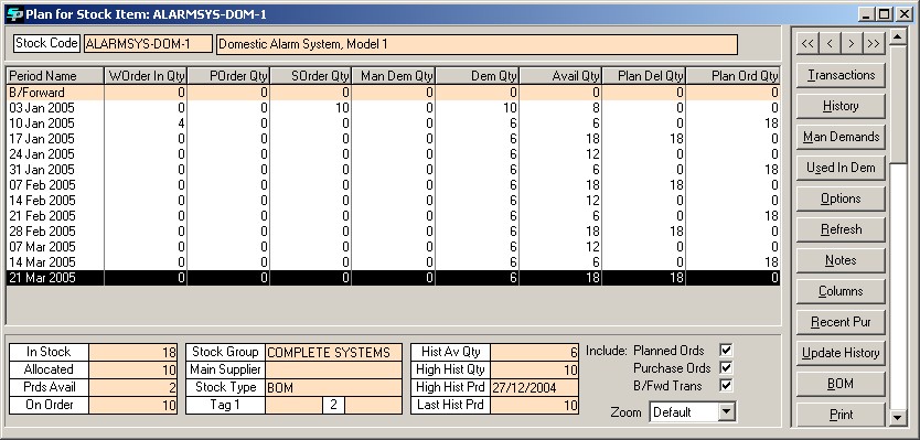 Now we can see StockPlan has planned purchase orders to prevent the potential stock shortage we would have had in May. The Plan Del qty column shows us when the planned purchase order quantities will arrive and hence go into the available stock. The Plan Ord qty column shows us based on leads times and ship times and stock allocation delays which period we would need to order these. The Min and Max Cover columns show what the minimum and maximum cover periods mean in terms of qty on that period. StockPlan will maintain the available stock within these two qty's. Don't forget it is taking all the other factors into account which we have mentioned so far. If a new sales order is entered into Exchequer or a customer is omitted in StockPlan this is reflected instantly. Using the optional purchase order creation module StockPlan will collate all these planned purchases for all or a selection of items into an on screen list. You specify up to what date you would like to create orders for and StockPlan checks all the plans to determine the items you need to order and includes them in the list. You can then amend this list, changing the suggested quantities, adding new items, etc. StockPlan provides on screen weight and volume totals on this screen in case you want to adjust the orders to ensure you fill a container or do not exceed a weight limit. Facilities exist for you to print or email this suggested order list. Once you are happy with the list, click on a button and your purchase orders are automatically created in Exchequer . As soon as this is done StockPlan will see all the new outstanding purchase orders it just created, the available stock is effected by what are now real outstanding purchase orders and the Planned Del and Planned Ord columns are also updated accordingly. First having read the above you will have a pretty good understanding of how the planning engine works with regards to predicted future sales and planning your purchases to satisfy them. Production planning works in pretty much the same way with the following differences. 1 - If the item is a Bill Of Materials type item then the planned orders are planned works orders not purchase orders. 2 - The lead time against the BOM item becomes the production time. 3 - Existing outstanding Works Orders not yet completed need to be taken into account. 4 - The demand for the BOM items works the same as for normal products with the exception of sub assemblies which will include an element of demand from other BOM items that they are used in. 5 - Plans for Components need to be effected by both the actual current works orders and planned works orders. See What About Components and MRP later in this chapter. So now when we look at the plan for a BOM item the Plan Delivery column is showing when the works order should be completed and arrive in stock and the plan order column when you should begin the works order. StockPlan uses the lead time to calculate how long it takes to build the item. The Works Order In qty (WOrder In qty) shows any quantities due on outstanding works orders that have not yet been completed. We still have a Purchase Order qty (POrder qty) column available should we need it for example we decide to purchase some items that we normally build. Using the optional StockPlan Works Order Processing module you can collate all or a selection of the Planned Works Orders into an on screen production list. You specify up to what date you would like to create works orders for and StockPlan checks all the plans to determine the BOM items which need to be ordered (to be built) and includes them in the list. You can them amend this list, changing the suggested qty's, adding new items, etc. Facilities exist for you to print or email this suggested order list. Once you are happy with the list, click on a button and the works orders are automatically created in StockPlan. As soon as this is done StockPlan will see all the new works orders it just created, the available stock is effected by what are now real outstanding works orders and the planned del and planned ord columns are also updated accordingly. Lets take a look at this plan, this is for an Alarm System which we build. Lets run through the plan - We start with 18 in stock, we have a demand of 10 (coming from sales orders as they exceed the historical) in the first week (we are working weeks instead of months with this item) leaving us with an available of 8 in week 1. In week 2 the demand is 6 (based on historical) BUT we also have a qty of 4 due on an existing works order leaving us with an available in week 2 of 6 (8 less 6 plus 4). On this item the cover has been set to minimum 1 period and maximum 3 periods, looking at the planned (works) order delivery and order columns we can see StockPlan is planning production to maintain the available between our min/max cover periods. Component Requirements and MRP If StockPlan plans that you should build a BOM item, its not much help if it does not also take into account the components you will need to build the planned orders. The demand for component items is effected by two additional elements when StockPlan is used in manufacturing. Firstly there is the demand coming from existing outstanding works orders that require some of the component item to build them. These are included in the plan in the Works Order Out (WOrder Out qty) column, this is combined with the other potential sources of demand such as direct sales etc. So the plan takes into account the requirements to build existing outstanding works orders. The WOrders Out qty is the total requirement from all current outstanding works orders for BOM items that use this component. As with most of the figures in StockPlan you can double click on the cell in the plan screen to drill down and view the sales orders, purchase orders or works order that make up that periods qty. Secondly we have the demand from the planned works orders that will use this component. These a